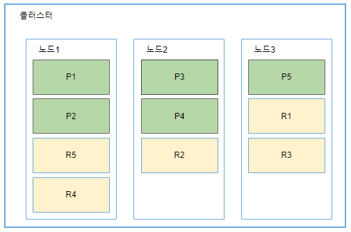 주 샤드는 녹색, 복제본은 노란색으로 표시된다. 노드1에 장애가 발생하더라도 노드2와 노드3이 사용할 수 있는 모든 샤드를 가지고 있다. 복제본은 해당 주 샤드에 장애가 발생하면 주 샤드로 승격될 수 있다.