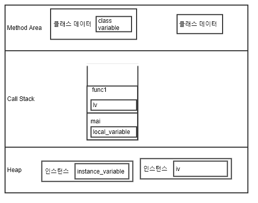 (class variable)클래스 영역 클래스가 메모리에 올라갈 때 인스턴스 변수