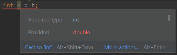double b = 0; int a = b;IDE에서 다음과 같이 적으면 빨간줄(컴파일에러)이 그이며, 다음과 같은 것을 볼 수 있습니다 (Intellij의 경우 )