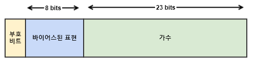 바이어스된 표현 : 실제 지수값을 얻어 낼 영역이다. 2^(k−bias)에서의 k값을 나타냅니다. bias는 거듭제곱의 범위가 음수와 양수에 걸쳐 고르게 나타날 수 있도록 정해놓은 오프셋으로, 32비트 자료형에서는 27의 값을 가집니다.