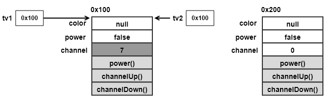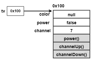 연산자 new에 의해 Tv 클래스의 인스턴스가 메모리의 빈 공간에 생성된다. 주소가 0x100인 곳에 생성되었다고 가정하자. 이 때, 멤버변수는 각 자료형에 해당하는 기본값으로 초기화 된다.